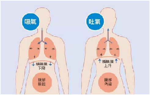 胸腹联合式呼吸:胸式呼吸和腹式呼吸的结合,这种呼吸法在吸气时会全面扩大胸腔的容积